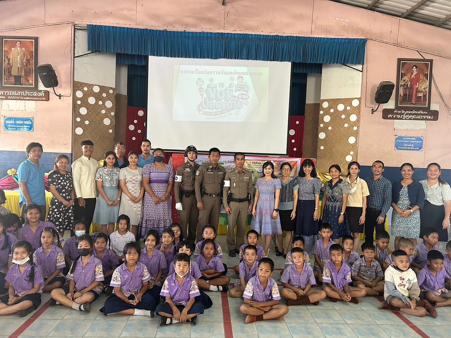บรรยายให้ความรู้ด้านความปลอดภัยในการใช้ทางม้าลายหน้าสถานศึกษาแก่นักเรียนชั้น ป.1-ป.6 ณ โรงเรียนบ้านมะขาม